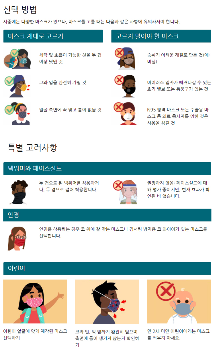 CDC는 공공장소, 행사, 모임 그리고 주변에 다른 사람이 있는 모든 곳에서 마스크를 착용할 것을 권장합니다. 또한 2021년 2월 2일부터 비행기, 버스, 기차를 비롯해 미국으로 들어오거나 미국내를 이동하거나 미국에서 나가는 모든 유형의 대중교통수단과 공항, 역 등 미국 교통 허브에서는 마스크 착용이 필수입니다.