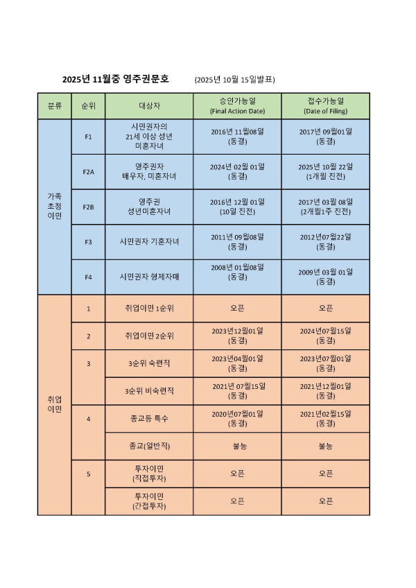 미국 국무부(DOS)는 10월 15일 2025년 11월중 영주권문호(Visa Bulletin)를 발표했습니다. 11월 영주권문호에서는 가족이민의경우 소폭 진전을 이루어졌고 취업이민은 전 카테고리에서 단 하루도 진전되지 못하고 동결 되었습니다.