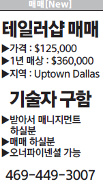 테일러샵 매매▷ 가격: $125,000▷ 1년매상: $360,000▷ 지역: Uptown Dallas기술자 구함▷ 받아서 매니지먼트 하실분▷ 매매 하실분▷ 오너파이넨셜 가능☎ 469-449-3007