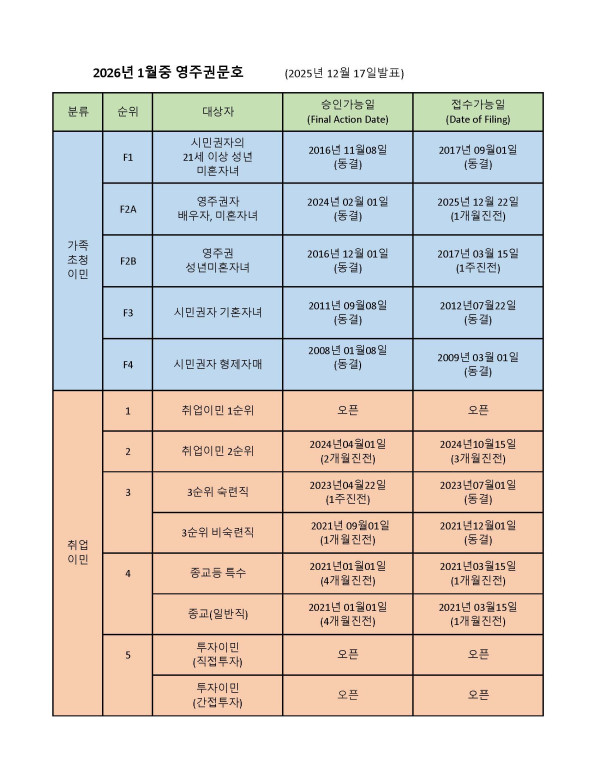 미국 국무부(DOS)는 12월 17일 2026년 1월중 영주권문호(Visa Bulletin)를 발표했습니다. 새해 1월 영주권문호에서는 가족이민의경우 영주권자배우자와 미성년자녀인 F2A와 영주권자 성인자녀 F2B의 접수가능일이 1개월과 2주 진전되고 나머지는 모두 동결되었으며, 취업이민은 승인가능일에서 2순위가 2개월 진전되고 3순위 숙련직이 1주,비숙련직이 1개월 진전 되었습니다.