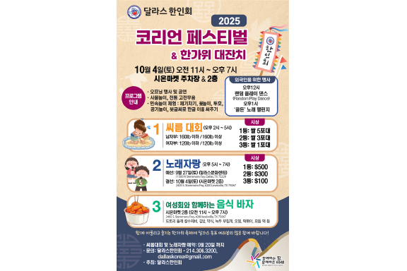 달라스 한인회(회장 김성한)가 주최하는 ‘2025 달라스 코리언 페스티벌 & 한가위 대잔치’가 오는 10월 4일(토) 오전 11시부터 오후 7시까지 루이스빌 시온마켓 주차장과 시온마켓 2층 에서 열린다.