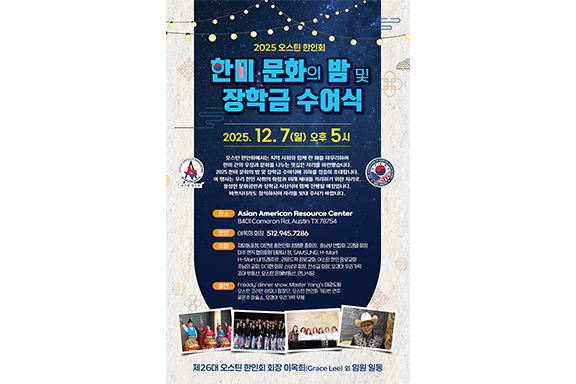 오스틴 한인회가 오는 12월 7일 오후 5시, Asian American Resource Center에서 ‘2025 한미 문화의 밤 및 장학금 수여식’을 개최한다. 오스틴 한인회는 이번 행사가 한 해를 마무리하며 지역사회와 함께 우정과 문화를 나누는 자리로 마련된 만…