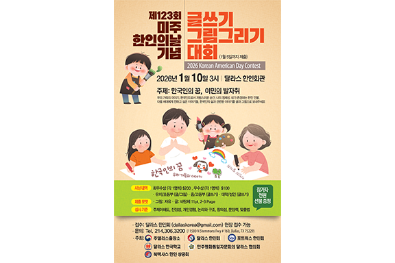 달라스 한인회(회장 우성철)는 주달라스 영사출장소, 포트워스 한인회 등과 함께123회 미주한인의 날 기념 글쓰기·그림그리기 대회를 개최한다고 밝혔다. 이번 대회는 한인 차세대와 가족이 함께 참여해 한인으로서의 정체성과 이민의 의미를 되새기는 자리로 마련됐다.
