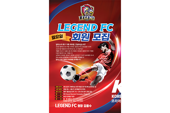 달라스 지역 축구 동호회LEGEND FC(회장 김흥수)가 2026년 시즌을 앞두고 신규 회원을 모집한다. LEGEND FC는 축구를 통해 건강과 즐거움을 나누고, 실력보다 매너와 팀워크를 중시하는 동호회로, 지역 축구인들의 꾸준한 참여를 이어오고 있다.김 회장은 “…