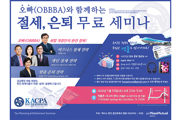 텍사스 한인공인회계사 협회(KACPA)는 오는 1 10() 오후 2시부터 5시까지 캐롤튼 시니어 센터에서오빠(OBBBA)와 함께하는 절세·은퇴 무료 세미나를 개최한다. 이번 세미나는 지난해 트럼프 대통령이 주도한 ‘One Big Beautiful Bill Act’에 따라 올해 시행되는 세법 개정안의 핵심 내용을 한인들의 실제 상황에 맞춰 설명하고, 개인·비즈니스 절세 전략과 은퇴 준비 방안을 종합적으로 다루는 것이 특징이다. 주최 측은복잡한 세법 변화로 고민이 많은 한인들에게 실질적인 해법을 제시하는 자리가 될 것이라고 설명했다.