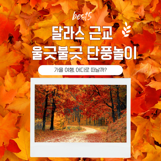 가을이 천천히 달라스에도 찾아왔다. 기상예보에 따르면 올해 텍사스의 단풍은 10월 초부터 물들기 시작해 11월 중순경 절정을 맞을 것으로 예상된다. 도심의 건물숲을 벗어나 자연 속에서 단풍의 절정을 만끽하고 싶다면 달라스에서 당일로 떠날 수 있는 다섯 곳의 여행지를 눈여겨볼 만하다.