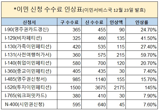 이민 신청 수수료가 12월 23일 부터 평균 21%가 올랐습니다. 23일자 우체국 소인이 찍힌 이민 신청 서류 부터는 기존의 수수료 금액을 지불할 경우 이민국에서 접수가 거부되고 반송됩니다. 접수거부로 반송되면 시간이 많이 지연될 뿐만 아니라 신청날짜가 매우 중요한 priority date와 21세를 넘는 자녀들의 에이지 아웃 등에 심각한 차질을 빚을수 있기 때문에 인상된 새 이민 수수료를 확인해 보내야 […]